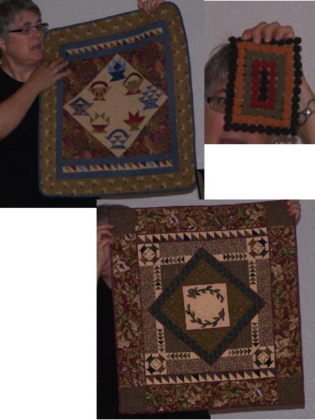 I could rattle on for pages of how many tiny pieces are in each project (like the blue and white to the left - I believe it was over 1,800 pieces) or how intricate even the quilting was, or how once Elaine tries one size - she keeps going down to where she ends upwith a quilt down to the size of a post card - instead, I'll let you just drool over what she brought to share.