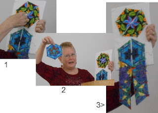 Wow, who knew that one technique could have so many names - Stack 'n Whack, kaleidoscope, hexing, etc. What ever you call it, I called it chopping up the fabric (shown on the left of quilt) mess around turning the diamonds until you get what you want. This is a wall hanging size.